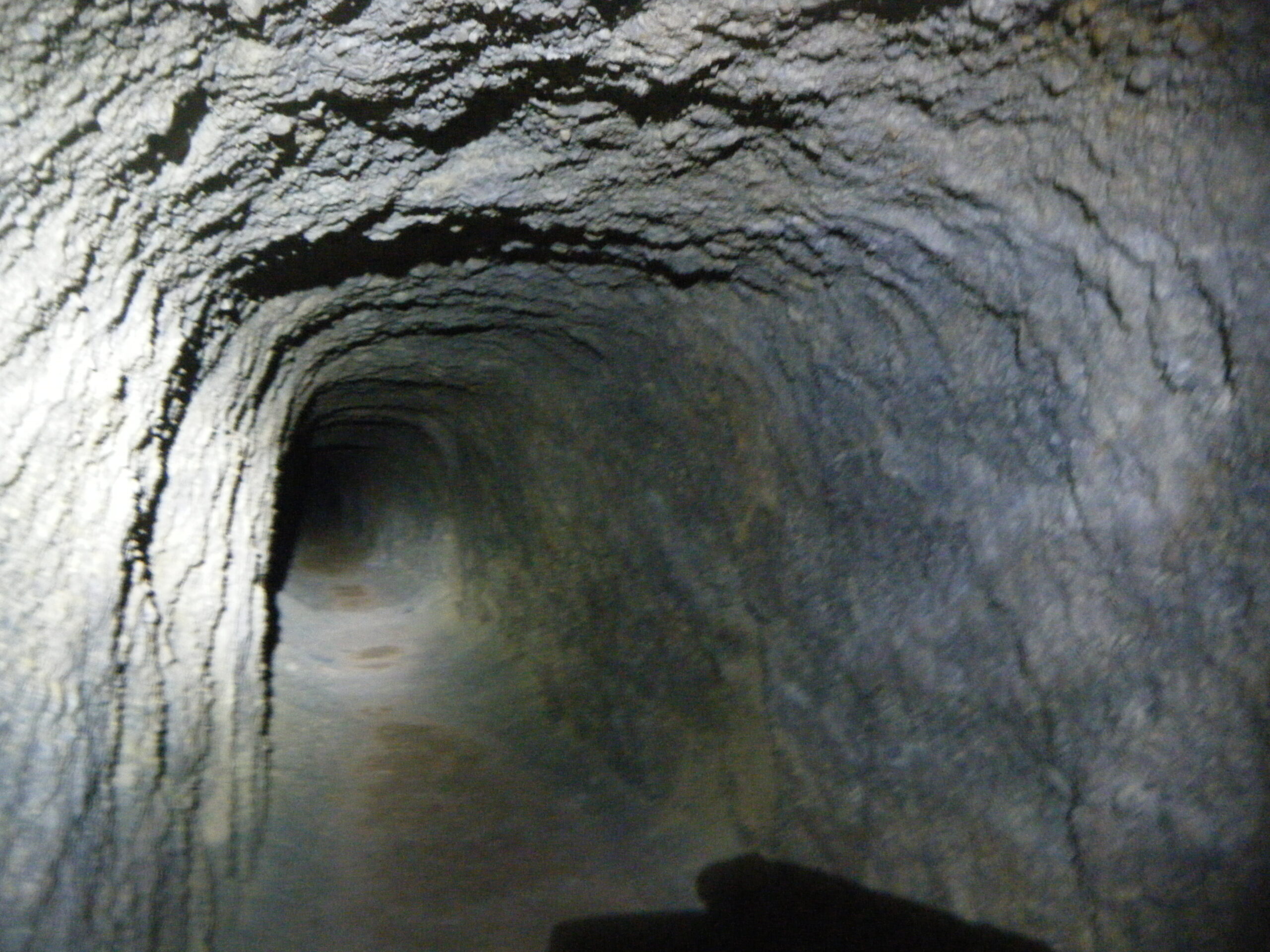A la izquierda de esta nave parte una galería horizontal, rectilínea y amplia, que tras unos 40 metros finaliza en una bifurcación en forma de “T”. Recorremos cada uno de los ramales entre el brillo de las pequeñas calcitas, percibiendo cómo el calor va aumentando a medida que nos internamos. La de la izquierda finaliza abruptamente en una pared. La de la derecha, en lo que parece ser un derrumbe. Esta última tiene, a su vez, otro pequeño ramal a la derecha, pero de corto recorrido.