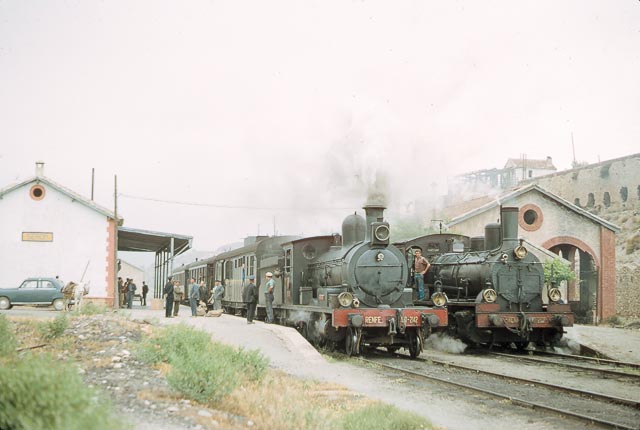 Country: SPAIN Operator: RENFE Item: Steam [STEA] Class or Maker: RENFE/130-2121 Wheel Arrangement or Type: 2-6-0 Number: 130-2142 Place details: SERON Station also 040-2366 Additional notes: 1674mm Original source material: Kodak 35mm slide Photographer: James M Jarvis Copyright: Photographer Library locator reference: JMJA.0002 30937 Transport Photograph Database 1966MAY30JMJA066cs