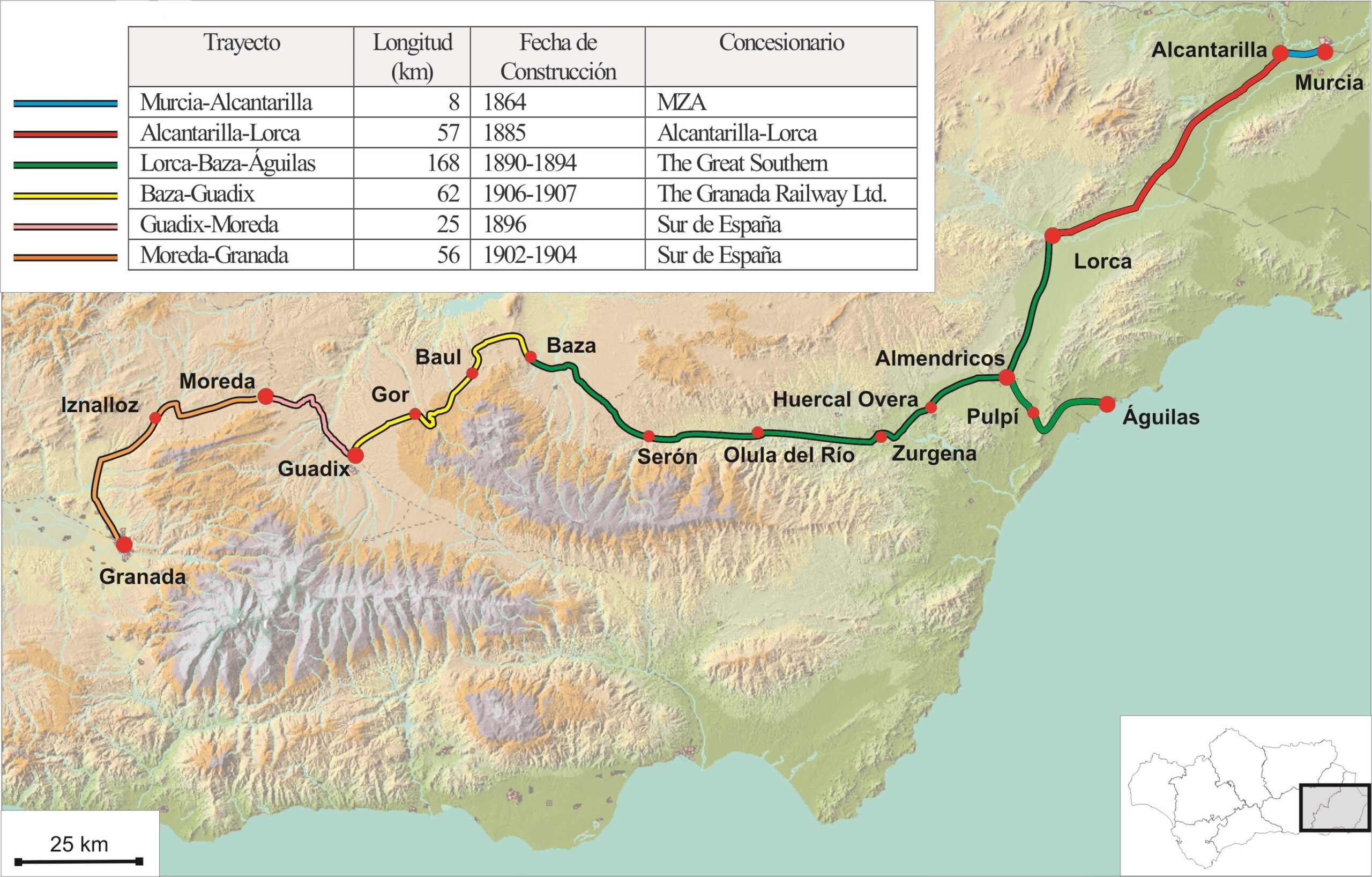 Recordemos que habría que esperar unos trece años para su conexión con Guadix y Granada una vez quedó inaugurado el Ferrocarril de Baza a Guadix en 1907. Es decir, desde la autorización por el Gobierno en 1870 para construir una línea de Murcia a Granada, hasta su terminación, habían trancurrido 37 años.