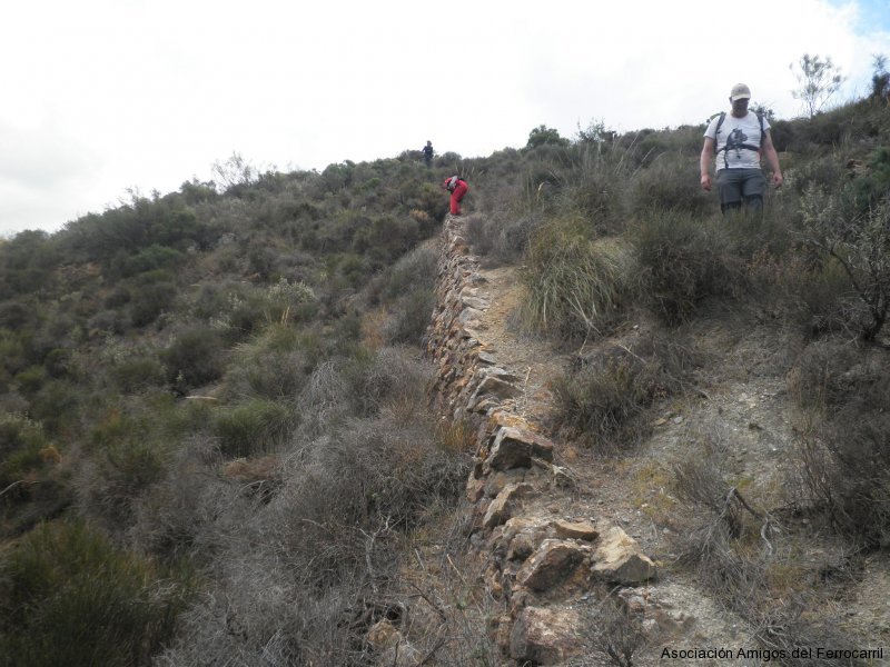 Solamente con la intuición y las referencias de Google Earth, la expedición partió desde el castillete del gran plano inclinado (más de 1 km. de longitud) bajando por su traza desde los 1.260 m. hasta la cota 960 m. Aparecieron varios tipos de escarpias, prueba evidente del lugar transitado, así como restos de traviesas que se desmenuzaron al tocarlas. La maleza se había hecho dueña y señora de lo que el hombre construyó y la bajada fue complicada, pero mereció la pena comprobar que el ingenio humano no tiene límites. En la base del plano se pusieron de manifiesto las dudas entre los participantes en esta ruta sobre cómo se salvaba un barranco hasta alcanzar la mina “Por si acaso” y, también, comprobar la existencia de la base de un pequeño puente por el que transcurriría la vía minera que llegaba a la boca de esta mina. Aquí, el polvo  del mineral de hierro teñía de rojo toda la zona y ofrecía una cantidad de rocas que hizo las delicias de los más aficionados a la mineralogía.